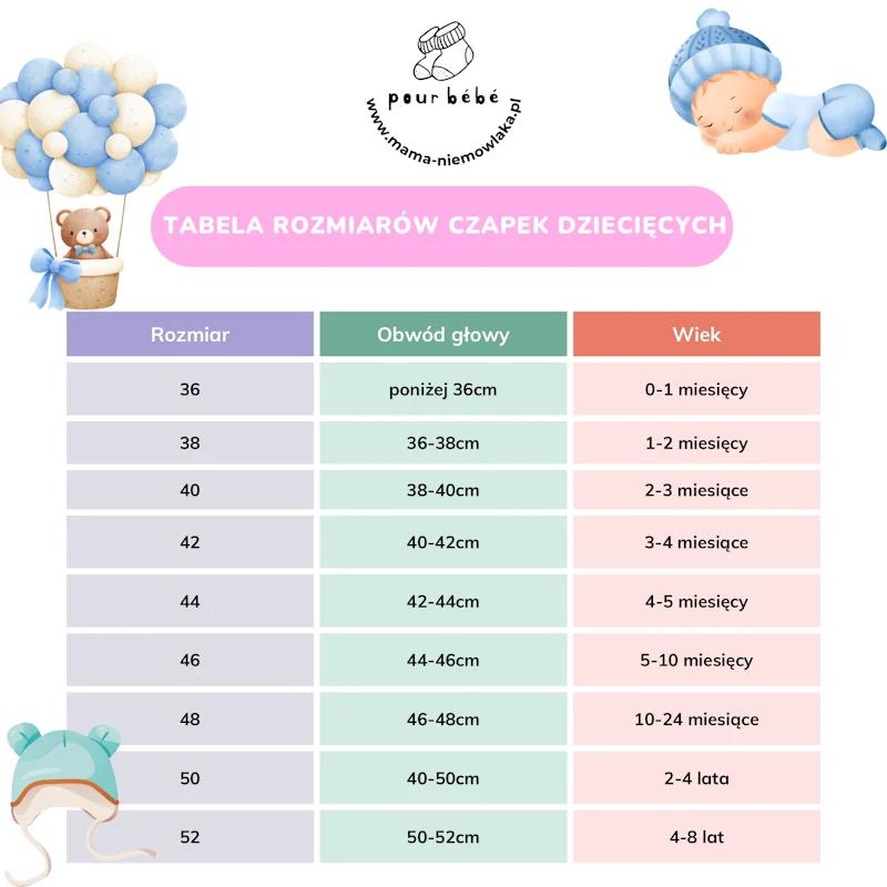 | Czapki | Dopasowany do obwodu główki | Regularnie mierzyć obwód główki dziecka. |